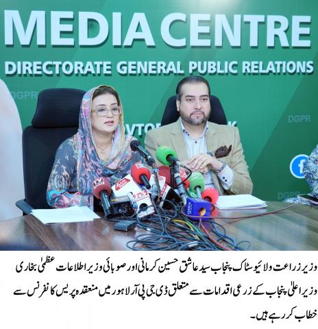 وزیرِ زراعت و لائیو سٹاک پنجاب سید عاشق حسین کرمانی کی صوبائی وزیر اطلاعات ظمیٰ بخاری کے ہمراہ ڈی جی پی آر لاہور میں وزیر اعلیٰ پنجاب کے زرعی اقدامات بارے پریس کانفرنس