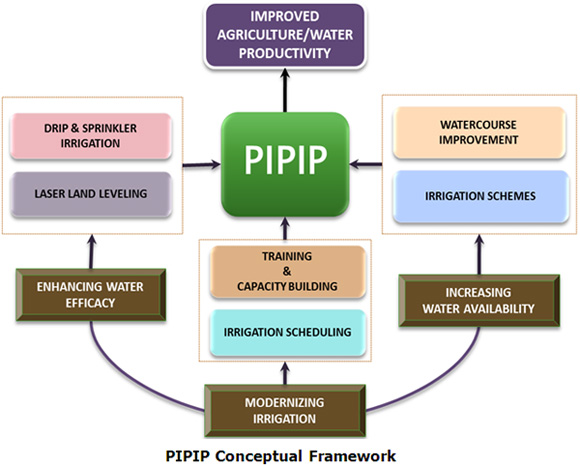 The overall project development objective (PDO) is to improve water productivity i.e. producing more crop per drop. The goal will be achieved through increasing delivery efficiency, adopting improved irrigation practices, promoting crop diversification, and effective application of non-water inputs. The PDO would contribute to increased agricultural production, more employment opportunities in rural areas, higher incomes from farming, better living standards of the farmers, and improved environment. The project will have following key objectives: